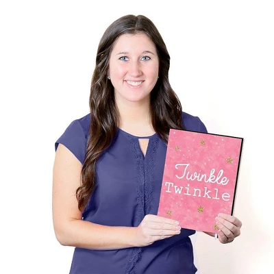 Pink Twinkle Twinkle Little Star Wall Art Set INCLUDES 3 ready-to-hang moon and star themed panels and non-marking wall mounts for easy hanging. Pink Twinkle Twinkle Little Star artwork is perfect for a nursery, kids room or playroom. Pink Twinkle Twinkle Little Star Wall Art & Kids Room Decor SIZE each 10 inches high x 7.5 inches wide x .5 inches thick. Moon and star lightweight art prints will arrive ready to use – no frame needed. The black edge gives each print a modern, finished look. EASY TO HANG: Simply attach a non-marking wall mount (included) to each corner of an Pink Twinkle Twinkle Little Star art panel and press to hang in desired location. Wall mounts are repositionable, so you can redesign your artwork display at any time. PREMIUM HOME DECOR: 3-piece Pink Twinkle Twinkle Little Star Wall Art Set is professionally printed on thick material with a black edge. You will not need to frame this set of twinkle room decor. Each standout print is ready to hang and will add a contemporary touch to any room. MADE IN THE USA: Pink Twinkle Twinkle Little Star – Baby Girl Nursery Wall Art & Kids Room Decor is designed and manufactured at our Wisconsin facility using materials that are Made in the USA. Pink Twinkle Little Star wall decor uses a No-Mess Glitter Print: Our artwork is designed with a printed image of glitter, eliminating glitter flake while maximizing bling effect!