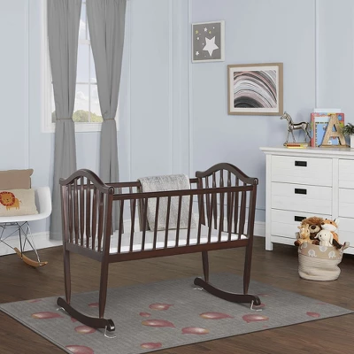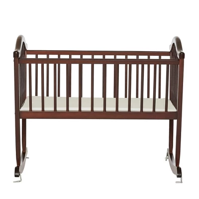 The Dream On Me Rocking Cradle is a must have nursery accessory for new parents. You can rock your infant gently to sleep thanks to the smooth rocking motion. It rocks to a steady pace and does not swing. Once the baby is asleep, the cradle can also be made stationary using the simple support pin on one side. Built of solid wood, the cradle delights with its flowing ergonomic stylish design enhanced by arched head and footboards, smooth edges and corners. It boasts roomy interiors and comes equipped with a slumber pad. It is available in five classy non-toxic finishes to go beautifully with the nursery of your dreams. At Dream On Me we prioritize safety. The Rocking Cradle is JPMA certified to meet or exceed all safety standards set by the CPSC and ASTM. The Rocking Cradle recommended for use with newborns to 20 pounds or until the baby can roll from side to side or push up. Product dimensions are 38 L x 22 W x 32.5 H inches. It weighs 17.5 lbs.