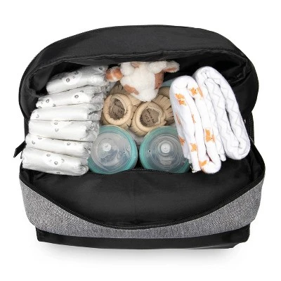 The Eddie Bauer Cascade Backpack Diaper Bag has room for everything you need for a day out or an overnight adventure with your little one. A spacious interior compartment and 12 pockets offer room for all of your belongings and baby’s needs including the diapers, bottles, blankets, toys, change of clothes and your personal items. Two interior pockets and one exterior insulated pocket keeps bottles and food fresh. This diaper bag is loaded with functional features including a removable changing pad and a unique side pocket for your personal wipes case that is great for on-the-go diapering. This bag features padded and adjustable shoulder straps and stroller loops for optimal comfort and convenience for travel. This neutral gray and black bag is the perfect everyday essential for any mother, father or caregiver.