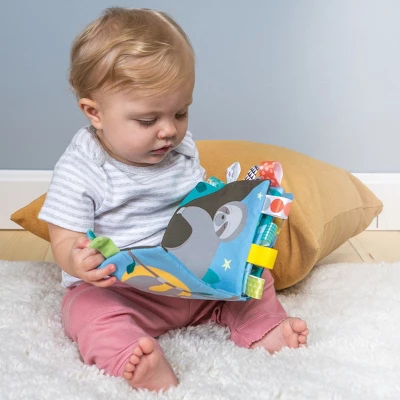 Your little one will not want to let go of these fun and adorable Sloth Lovey with Silicone Teether & Molasses Sloth Taggies(TM) Soft Book! The super cute one-piece molded animal silicone teether is permanently attached at the top corner of the matching soft lovey. Two knotted corners and a fuzzy plush back side provide tactile stimulation for baby. Blanket measures 10″ long. Book features eight fabric pages with a soft applique on the cover, crinkle paper lining, and a squeaker inside. With lots of attached ribbon taggies to explore, baby can bend, squeeze, and even chew on the pages while snuggling during story time. Molasses Sloth Taggies(TM) Soft Book measures 6″ x 6″ and has a velcro closure. Set includes both pieces and are machine wash, air dry.