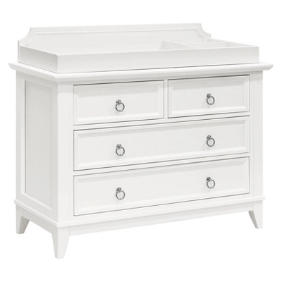 The Emma Regency Removable Changing Tray is the perfect functional accompaniment to the Emma Regency 4-Drawer Dresser. Featuring three compartments with a bold geometric styled back panel, this changing tray is the stylish accessory to seamlessly convert your baby’s dresser into a changing station that keeps all necessities at hand. The changing tray securely affixes to your Million Dollar Baby Classic double-wide dresser with safety brackets that are concealed in the back of the dresser. Once you are out of the diaper-changing stage, the tray can be easily removed to allow your dresser to grow with your child.