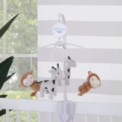 The Little Love by NoJo Jungle Ride Musical Mobile plays Brahms Lullaby. Holds baby’s attention while gently spinning. Features playful plush monkeys and giraffes in shades of brown, and gray. Includes a wind-up music box with mobile parts for mounting, along with easy to follow directions. Fits most standard cribs. Coordinates with the Jungle Ride bedding and accessories.