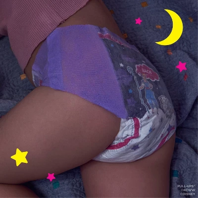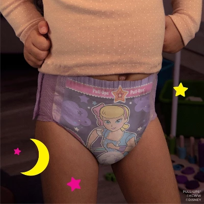 Nighttime potty training is made easy with Pull-Ups Night-Time Potty Training Pants, the only disposable training underwear designed specifically for nighttime! These training underwear absorb more than diapers* and offer up to 12 hours of overnight protection for your toddler. They are made with soft and breathable materials, so your child can stay comfortable as they sleep. With refastenable, easy-open sides, you can keep clothing on your child and have quick changes in the middle of the night. The soft, stretchy sides provide an underwear-like fit and slide up and down to promote Big Kid independence. Pull-Ups Girls’ Night-Time Potty Training Pants feature Disney·Pixar designs of Bo Peep from Toy Story, with graphics that fade when wet to help your little one learn and celebrate dry nights. No matter where your child is in her potty training journey, the Pull-Ups brand can help. Visit the Pull-Ups website for expert articles, tips and potty training resources. We’ve helped train 60 million Big Kids and counting! Pull-Ups Night-Time Girls’ Training Pants are available in sizes 2T-3T (16-34 lbs) and 3T-4T (32-40 lbs). (*vs. size 3-5 Huggies Little Movers diapers)
