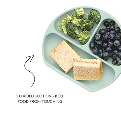 - Strong suction base attaches to most surfaces and 3 divided sections to keep food from touching