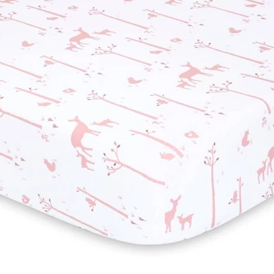 Transport your little one to a fanciful forest scene with this Pink Whimsy/Pink Woodland 2pk Sheet set from PS by The Peanutshell. Cute silhouettes of forest creatures sit among the trees in shades of soothing pink against a crisp white on one sheet, while on the other, soft pink is the ground for sweet woodland motifs, including leaves, stems, and woodgrain hearts. Microfiber fabric is touchably soft and the easiest of care; pack of two allows for quick changes. Perfect for any little girl’s room!