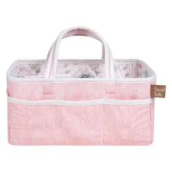 Add organization to any area of your home with the portable Mountain Baby Storage Caddy by Trend Lab. Perfect for dressers and changing stations, this lightly padded caddy has 8 outer pockets and a removable “T” separator for maximum versatility. The body and handles feature a pine tree print in dark green with a simple herringbone print in gray and white lining and a white trim. Keep diapers, wipes and other necessities tidy while traveling from room to room. Caddy also functions as an organizer for crafts, picnics, pet supplies, etc. Measures 12 in x 6 in x 8 in.